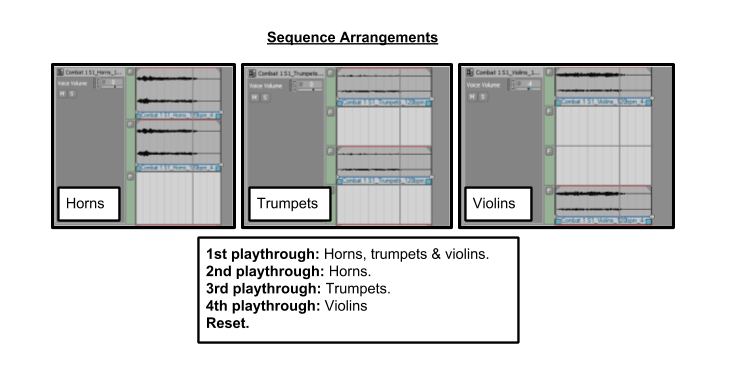 The combat playlist had the potential for many more variables. However, the approach would have lost the originally composed melodies, with too much room for randomisation, it would be unlikely to remember any of the melodic content. For this reason, the music themes have been arranged to transition into the next phrase of the melody, after eight bars, which is equal to four transitions, the music will branch into a new random theme or rhythm section. See below for more details on the combat playlist.