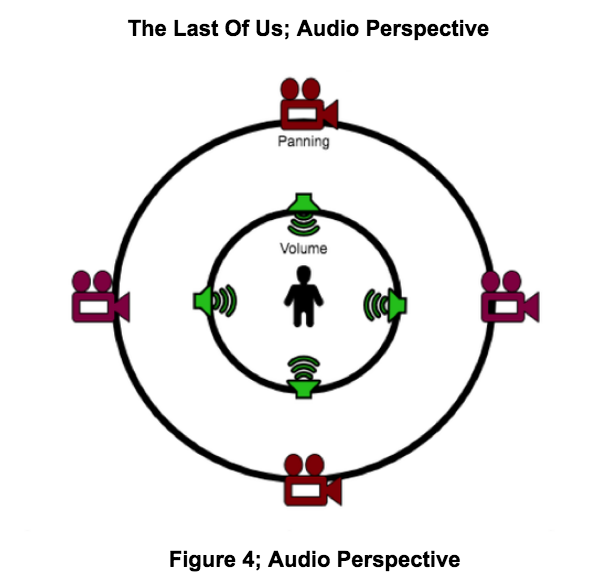 In Film the camera is a spectator that enables the audience to view the narrative, from here the audio editor can change how an audience is perceiving the audio. Perhaps the audio is from a character's perspective; maybe the audience is experiencing sound from the camera's point of audition (camera perspective), conceivably the audience could be hearing completely unrelated sounds that do not relate to the picture, a form of juxtaposition. In video games, this is a concern, although some of these techniques can be applied to cinematics within a video game; however, a combination of these techniques during gameplay would only cause disorientation for the gamer. Games like The Last of Us face the inevitable obstacle in audio perspective, should the active participant hear from the camera location? (Camera on the player) Or should the perspective be from the character being controlled?. Lanier [5] discussed this issue during his GDC talk and explained how it did not sound right from the camera's perspective, as the sound became too reactive, easily breaking the immersion from the character. While from the character's perspective, the sound was not responsive enough. This problem is not only specific to games but is also specific to the third person game genre. In first-person games, the solution is much simpler, as it is only natural that sound is heard directly from the character/camera perspective. Lanier details how the team went for the middle-ground approach, placing the audio volume between the character and camera, while audio panning is from the camera's perspective. See figure 4 below for details.